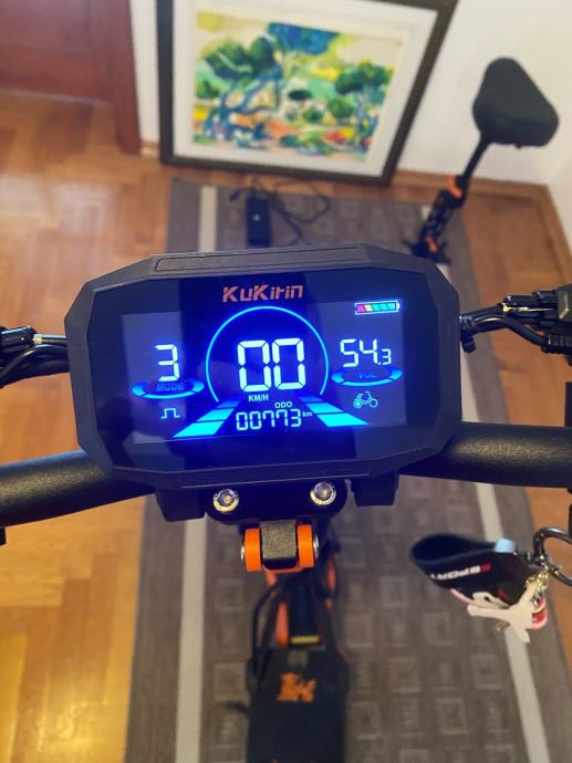 Električni romobil kukirin g2 pro 2025 verzija.Maximalna brzina 55 na sat moze proci 55 km. Dobije se punjac sjedalo kljucevi sarafi i sve potrebno.Ne dobije se torba sa slike.Kaciga plus 70 e ako kupac to zeli.