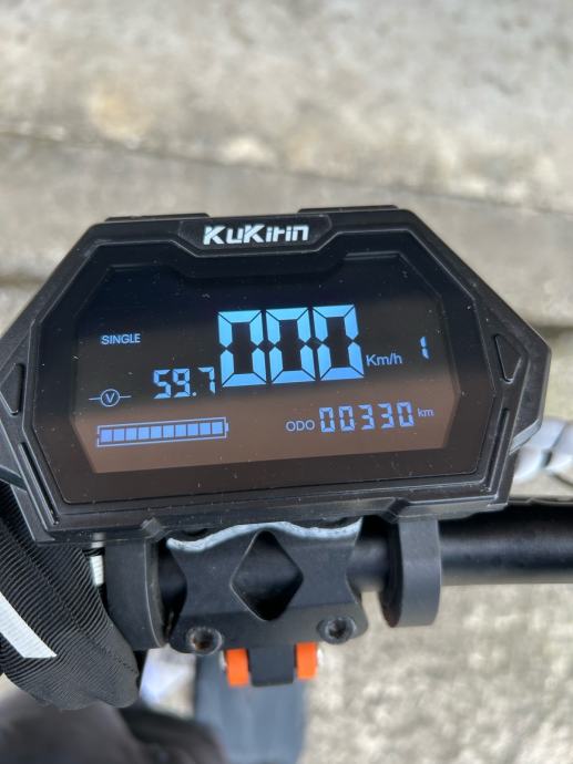 romobil kao nov prjedenih 330 kilometara romobilu su ugrađene nove pakne i stavljena su dva svijetla s prijeda romobil ima kljuć. romobil može preći s jednim punjenjem do 70 kilometara i maximalna brzina mu je do 75 km/h može se staviti blokada u tom slučaju romobil u največoj brzini ide 25 km/h