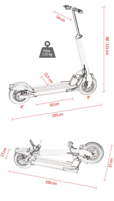 Okvir romobila izrađen je od aluminija certificiranog normom ISO te može podnijeti opterećenje i do 120 kg. Upravljač je podesive visine s ergonomskim gripovima, pogodan je za vozače visine 150 – 210 cm. Iz sigurnosnih razloga je preporučena dob korištenja za starije od 16 godina. Gazište je duljine 50 cm, a širine 15,5 cm.