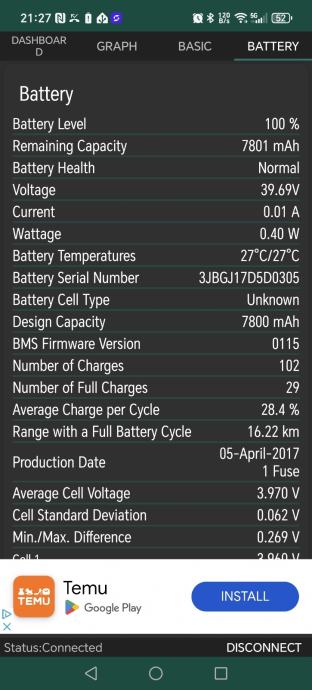 Kako je dugo stao u garaži i nije se punio imao je problema pri paljenju ali nakon popravka radi ispravno (promijenjene su 3 ćelije i prelemljen je cijeli battery pack).