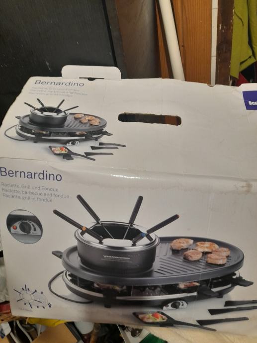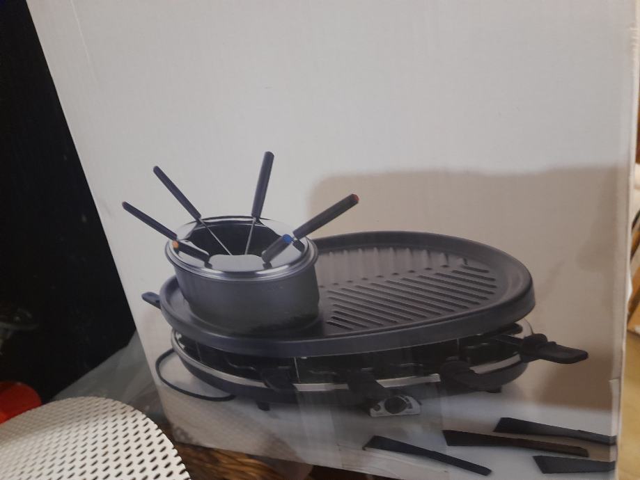 Rostilj i fondue.Jednom isprobala djeca.Sa vilicom su zdjelu za fondue malo ogrebli.Inače nema druga oštećenja.Ne saljem.
