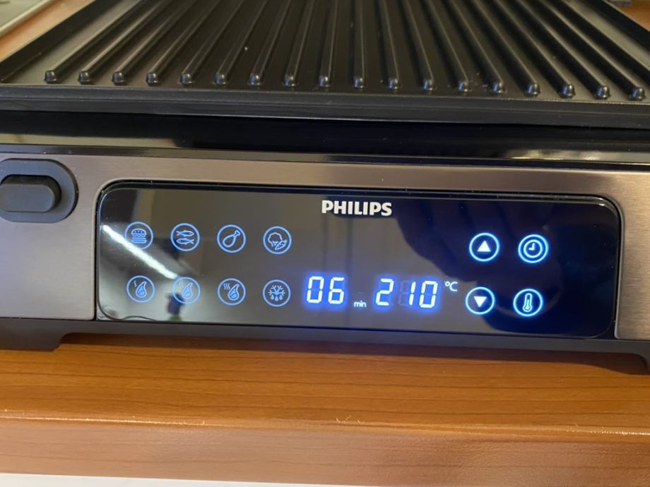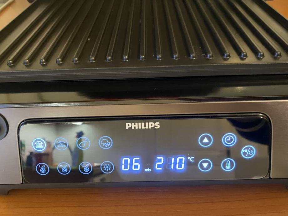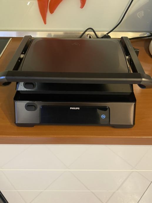 Digitalni Philips grill ima 8 funkcija za pečenje burgera, mesa, ribe, kobasica, povrća te za odleđivanje namirnica. Snaga mu je 2200 W, brzo se zagrijava i ima precizan mjerač vremena. Dijelovi na kojima se peče se odvajaju radi lakšeg čišćenja, a visina ploča za grilanje može se prilagođavati namirnicama. Može se koristiti kao sklopivi pekač ili - otvren na 180° - za roštiljanje na rčitavoj radnoj površini.
