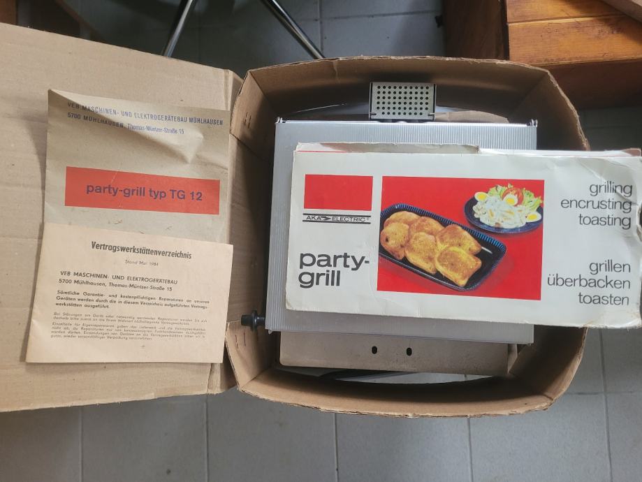 Starinski električni roštilj sa dokumentima za uporabu i originalnim pakiranjem.
