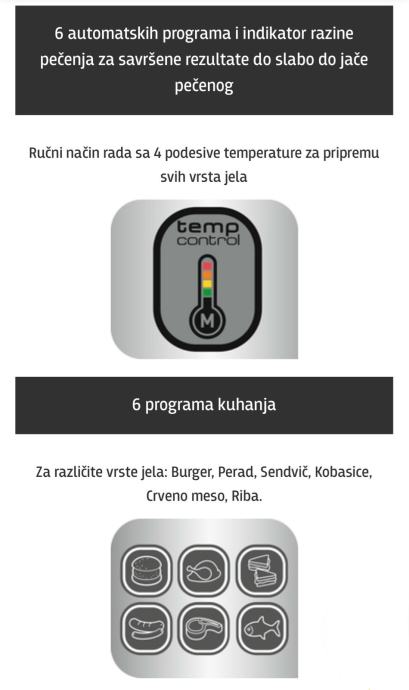 6 programa kuhanja (Burger, Perad, Sendvič, Kobasice, Crveno meso, Riba).