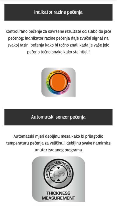 Automatski mjeri debljinu mesa kako bi prilagodio temperaturu pečenja za veličinu i debljinu svake namirnice unutar zadanog programa.