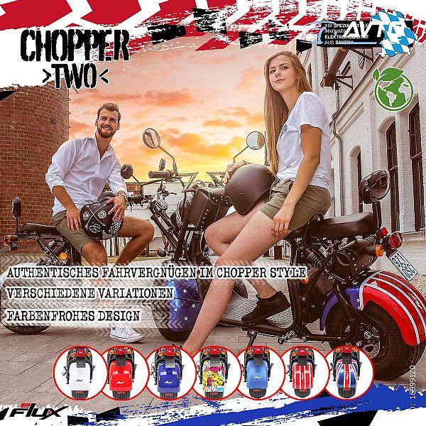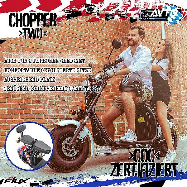 Čista zabava u vožnji s kultnim faktorom: Ovaj e-čoper neće vas pratiti samo ljeti. To je moderno prijevozno sredstvo u svako godišnje doba: ekološki prihvatljivo i bez buke, daje značajan doprinos e-mobilnosti. S pogonom na baterije, širokim gumama i brzinama do 45 km/h pouzdani ste i sigurni na cesti. Bilo sami ili u paru, u slobodno vrijeme ili u svakodnevnom životu: eFlux Chopper Two jednostavno je zabavan. Dovoljna je vozačka dozvola za automobile i skutere (klase B ili AM) da bi e-chopper mogao voziti na cesti. S jednim punjenjem možete prijeći do 35 kilometara. Dakle, više nego dovoljno za opuštajući jednodnevni izlet u okolici. E-skuter teži samo 72 kg i stoga je jednostavan za korištenje.