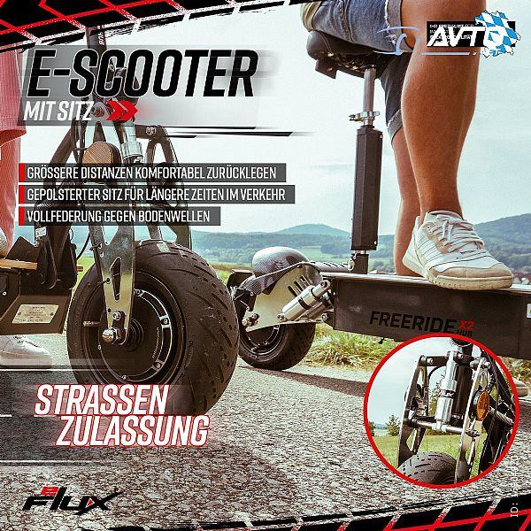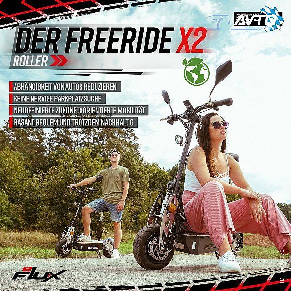 Tražite li visokokvalitetan električni skuter s odobrenjem za vožnju na cesti koji ne samo da utjelovljuje zabavu u vožnji, već vas može i odvesti daleko? Želite li smanjiti ovisnost o automobilu i stati na kraj dosadnoj potrazi za parkirnim mjestom? Snažan pogon i uvjerljiva sigurnosna oprema važni su vam ako od sada želite sami koristiti elektromobilnost na dva kotača? S visokoučinkovitim električnim skuterom eFlux Freeride X2 možete potpuno redefinirati mobilnost usmjerenu na budućnost: ovaj visokoučinkoviti električni skuter s odobrenjem za vožnju na cesti brzo, sigurno, fleksibilno i ekološki prihvatljivo vodi vas od točke A do točke B.