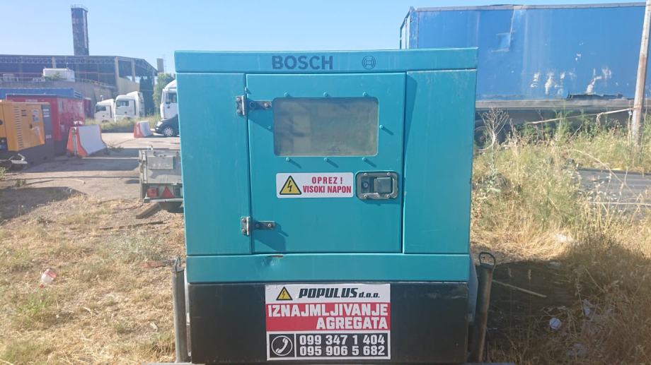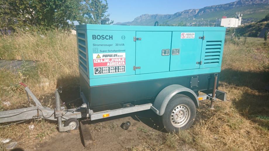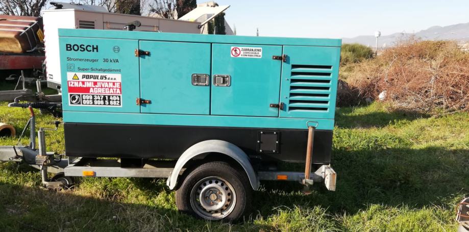 Dajem u najam agregat BOSCH 30 kVa sa pogonskim motorom Iveco 3 cil. Agregat je na svojoj registriranoj prikolici tako da je može vući svako vozilo sa kukom. Spreman za rad. Sa našim vlastitim prijevozom u mogućnosti smo Vam dostaviti agregat na gradilište veoma brzo. Agregat može pokriti manje zahtjevno gradilište a pokazao se idealan za stroj za žbukanje zbog pouzdanosti veoma tihog rada i velikog rezervoara. Ugodan najam uz pouzdanost, korektnost i kvalitetne agregate. Kad niste sigurni u kvalitet agregata uzmite Njemački (EVROPSKI) proizvod i nećete pogriješiti. Spremni smo i u mogućnosti izvršiti svaki vaš realni zahtjev, transport, montažu, spajanje, preinake, za dogovor oko konfiguracije ili cijene nazovite nas.