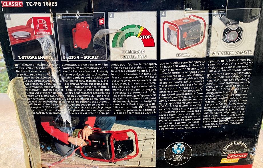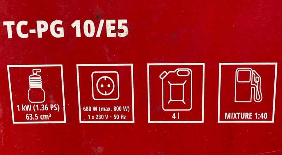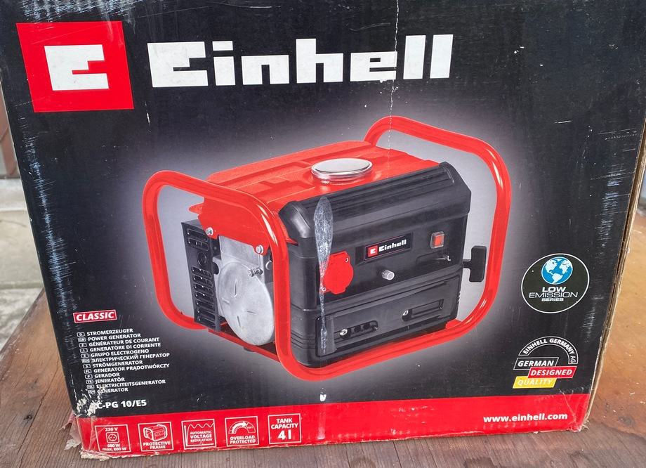 Einhell TC-PG 10 / E5 agregat za struju pokreće snažni, robusni, benzinski 2-taktni motor i generira kontinuiranu snagu od 680 W. Idealan je svugdje gdje se električna energija treba proizvoditi neovisno o glavnoj mreži, npr: gradilištima, prilikom kampiranja, garažama ili čak za odmore. Električna energija se isporučuje putem standardne utičnice od 230 V na koju se mogu priključiti svi uređaji, poput svjetiljki, vrtlarske opreme, alata ili kuhinjskih uređaja. Einhell agregat na struju ima potporni okvir za zaštitu uređaja, a čvrste noge osiguravaju da čvrsto i sigurno stoji u radu. Kako bi agregat i povezana oprema bili sigurni, on ima prekidač za preopterećenje i mali izljev ulja. Pokretanje agregat je vrlo jednostavno zahvaljujući laganom povlačenju kabela na starteru.