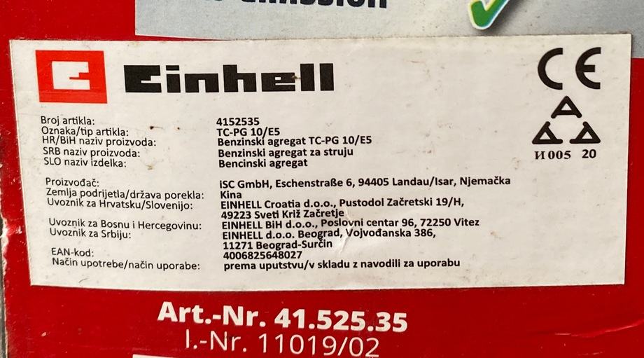 Prodajem jednom korišten agregat za struju Einhell TC-PG 10/E5.