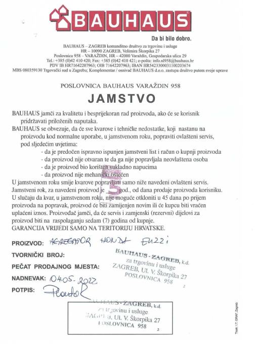 Garanica BAUHAUS 5 godine teče od 04.05.2022. godine.