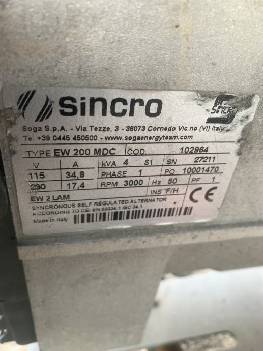 Prodajem trofazni agregat marke Sincor ew200, sa benzinskim motorom honda gx390, 339 radnih sati, na ručno paljenje, agregat ima i pripremljeno i za zavarivanje, agregat u doličnom i radnom stanju, sve radi bez problema i jako lijepo vari, može se i isprobatZa više informacija ako može na mail miha694@gmail.com ili mobilni broj 031 432 084 može i viber/ whatsapp ( nalazim se u Sloveniji, blizu Zagreba)