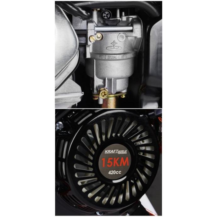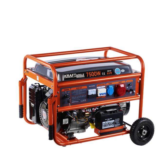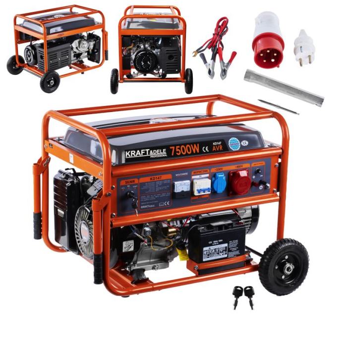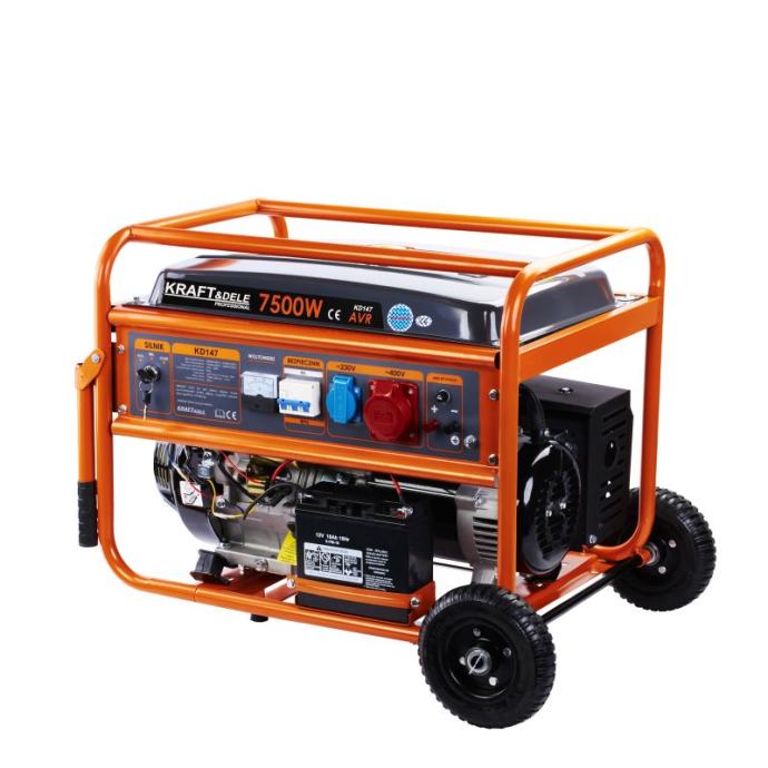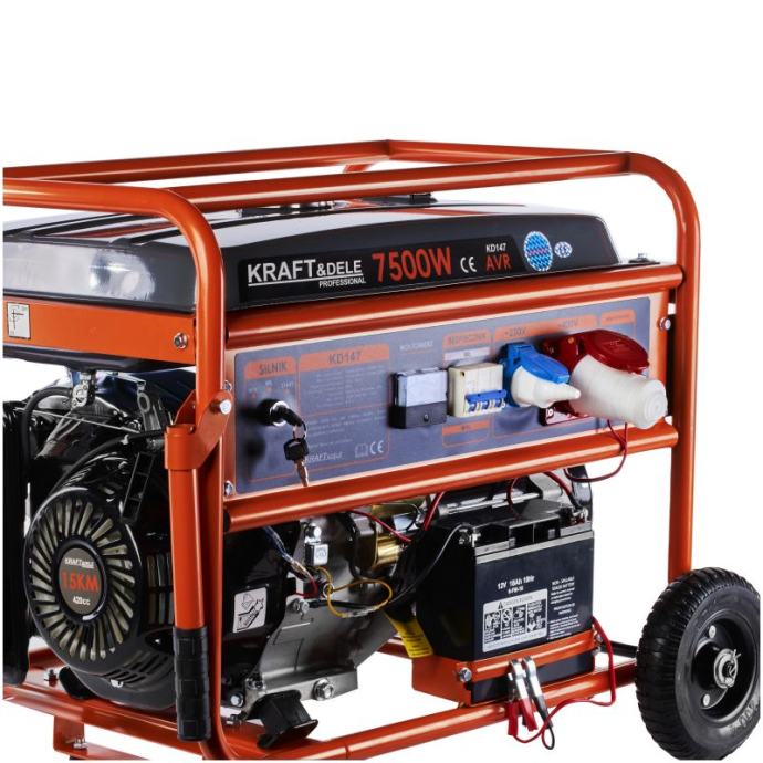Prijenosni benzinski agregat za struju KRAFT&DELE generira 6500 W kontinuirane snage i maksimalnu snagu od 7500 W kroz snažni, robusni i čisti japanski OHV četverotaktni pogonski motor. Jedna utičnica od 230 V i jedna utičnica od 400 V, uključujući voltmetar koji pokazuje trenutni napon, predviđene su za pretvaranje struje u terminalnu opremu. Funkcija AVR (automatska regulacija napona) osigurava stabilnu izlaznu snagu. Spremnik od 25 litara opremljen je prikladnim indikatorom razine za kontinuirani rad, te omogućuje rad generatora do 25 sati. Generator je opremljen mehaničkim i električnim paljenjem.