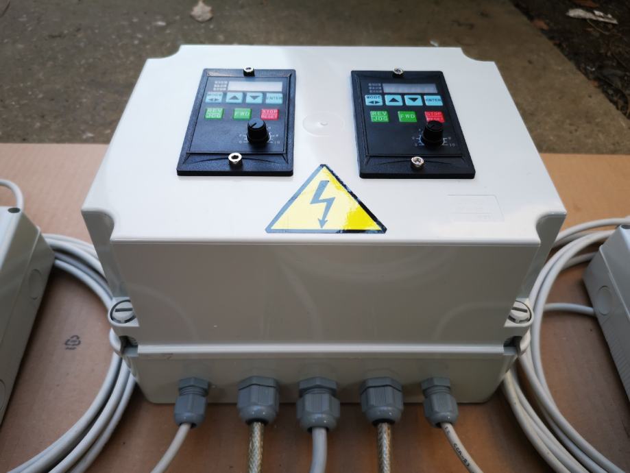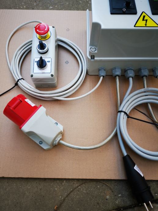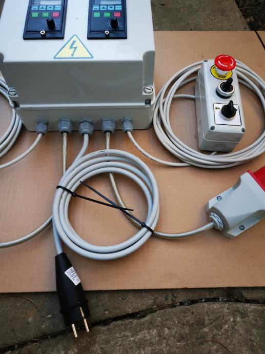 Kompletno upravljanje za 2 trofazna motora po 0.75 kW na monofaznu struju sa regulacijom broja okretaja i 2 dodatna upravljanja i 2 trofazne utičnice za štekanje elektromotora do 0.75 kW.