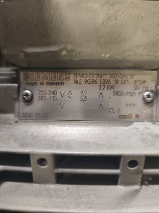 Prema natpisnoj pločici, pumpa je model ELMO-G 2BH1 607-0AE1, proizveden u Njemačkoj. Napon napajanja je 220-240 V (trokut) ili 380-415 V (zvijezda), struja 9,2 A odnosno 5,3 A, brzina vrtnje 2855 o/min, frekvencija 50 Hz, zaštita IP54, izolacijska klasa F.