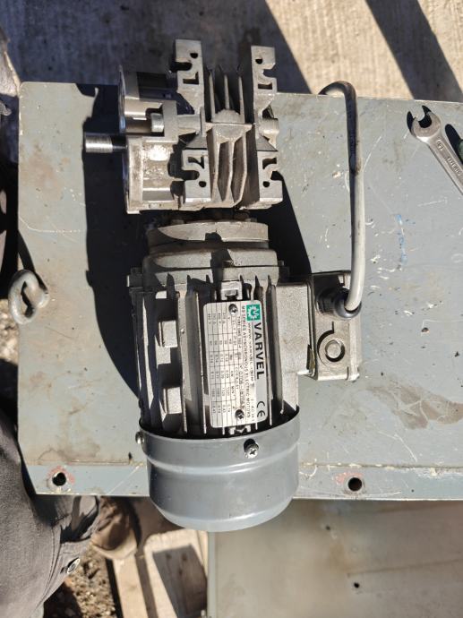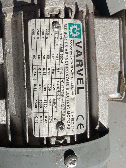 Prodajem trofazni elektromotor s reduktorom proizvođača Varvel, talijanskog porijekla. Radi se o asinkronom elektromotoru iz MS serije, tip SMS 562-4, s ugrađenim reduktorom priprijenosnog omjera i=40.
