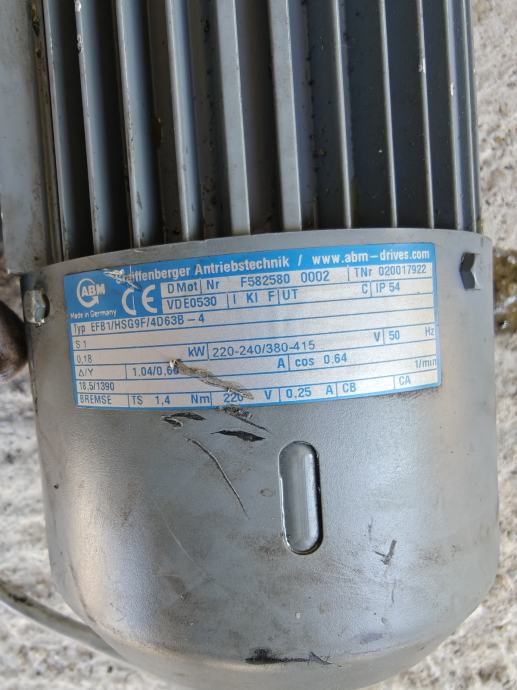 Prema natpisnoj pločici, radi se o modelu EFB1HSG9F/4D638-4, napona 220-240/380-415 V, frekvencije 50 Hz, snage 0,18 kW i cos φ 0,64. Brzina vrtnje je 1390 o/min, a reduktor daje izlaznu brzinu od 10,3 o/min. Kočnica radi na 220 V, moment kočenja 1,4 Nm. Stupanj zaštite IP54, klasa izolacije F.
