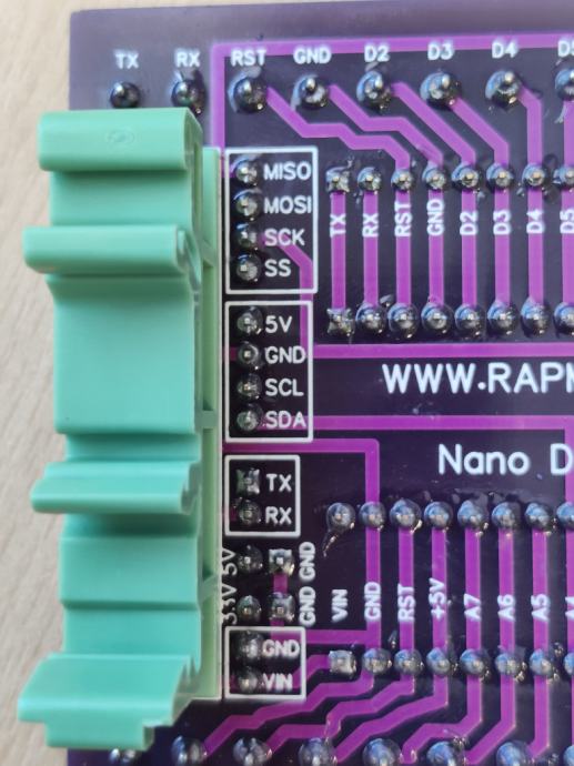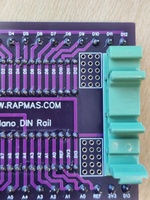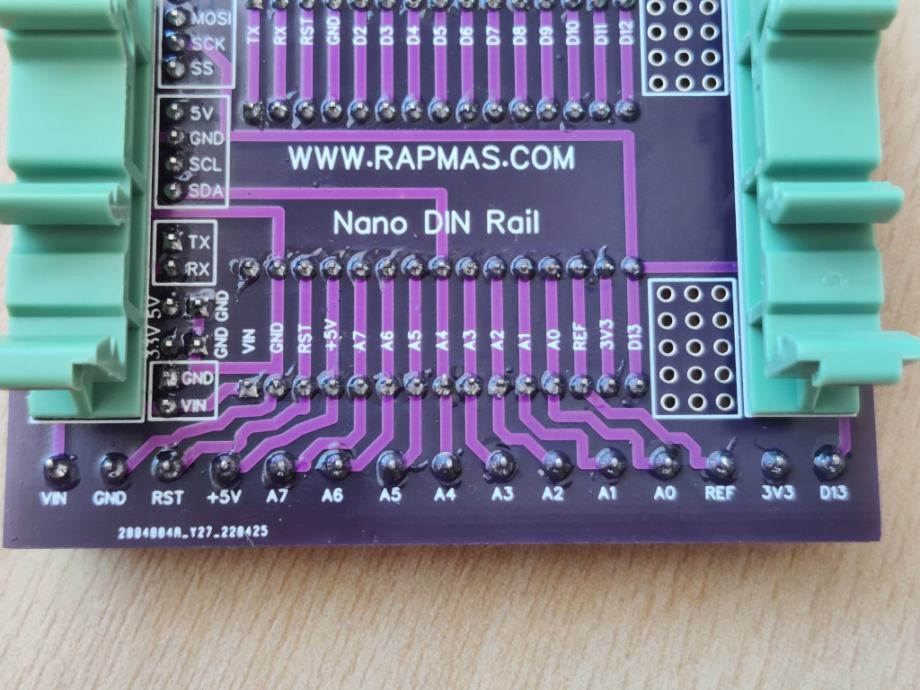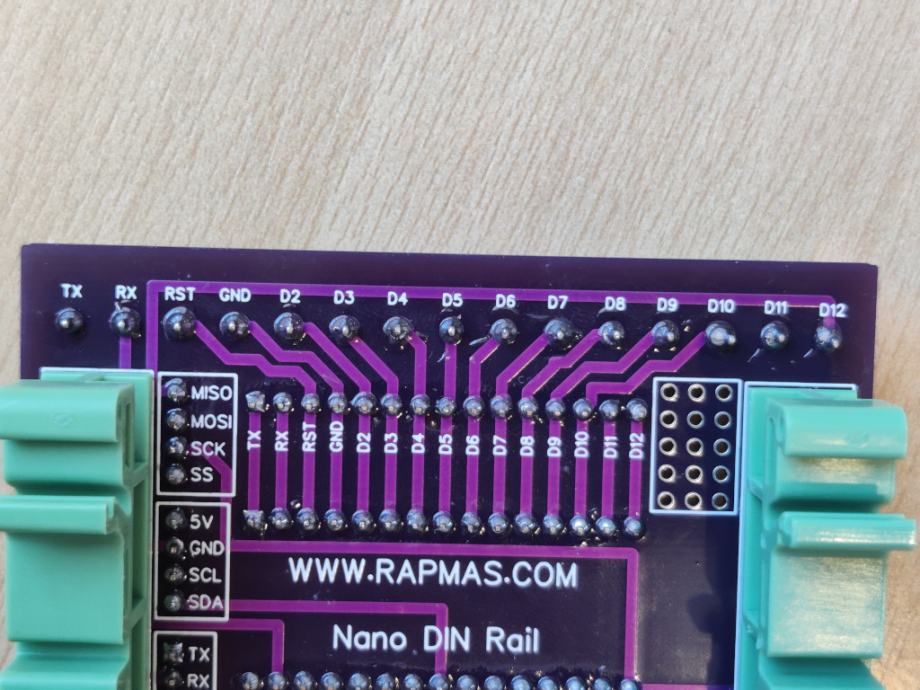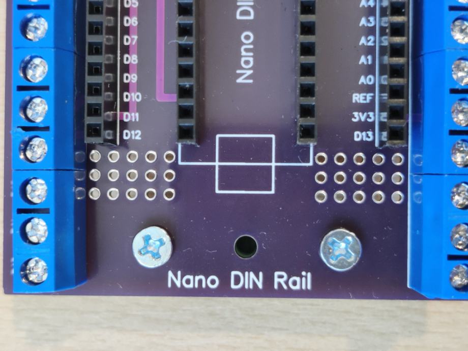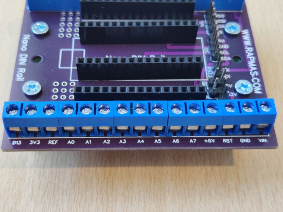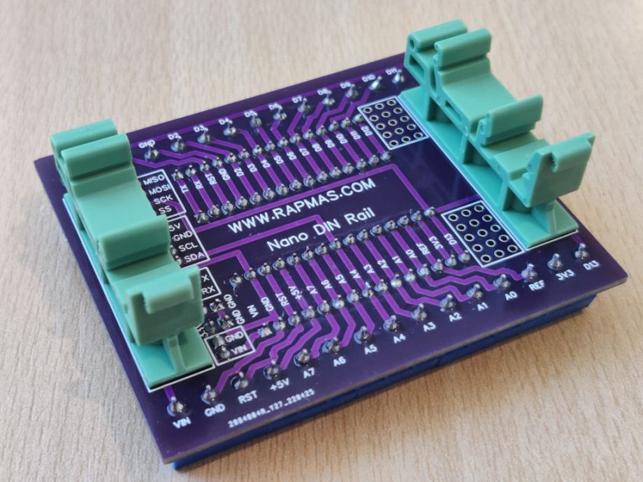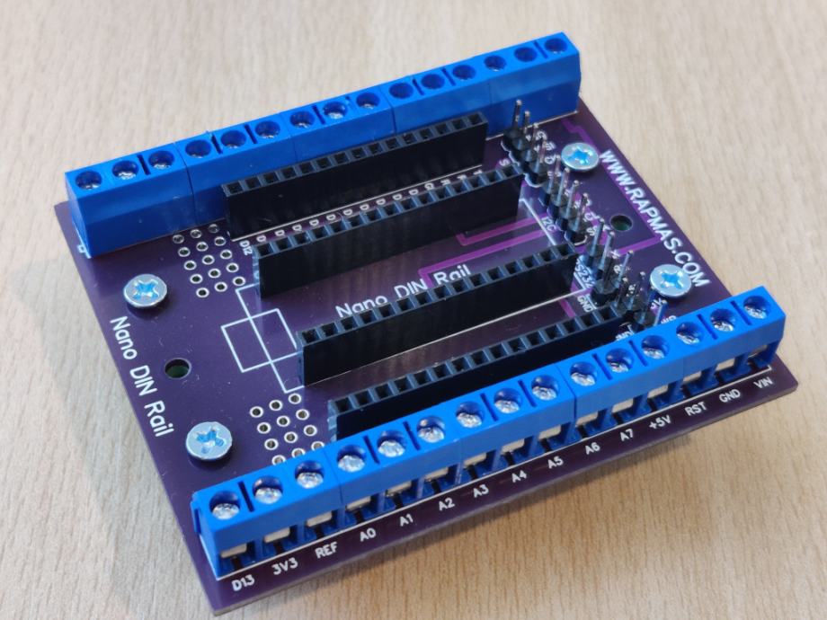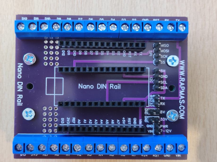 Ovaj adapter je namijenjen da osigura 2.54mm header i 5.01mm terminalni priključak za Arduino Nano na DIN šini. Svi pinovi su označeni na obje strane, i sa strane MCU-a i sa strane terminalnih priključaka. Također posjeduje dodatni 2X15 pinski 2.54 header.