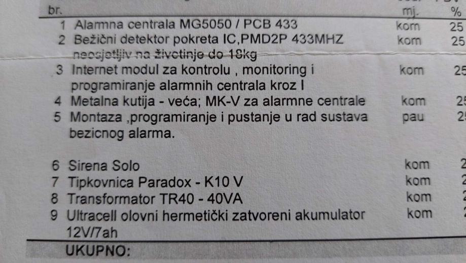 Sirena, detektori, tipkovnica, centrala, baterija - u komplet u ili pojedinačno. Pri demontaži izvršenoj od strane stručne osobe sve je bilo potpuno ispravno, a neposredno prije i u funkciji.
