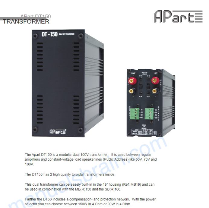 The Apart DT150 is a modular dual 100V transformer. It is used between regular amplifiers and constant-voltage load speaker lines (Public Address) like 50V, 70V and 100V.The DT150 has 2 high quality toroidal transformers inside. This dual transformer can be easily built-in in the 19” housing (Ref; MB19) and can be used in combination with the MB(R)150 and the SB(R)160.Further the DT50 includes a compensation and protection network. With the power selector you can choose between 150W in 4 Ohm or 90W in 4 Ohm.