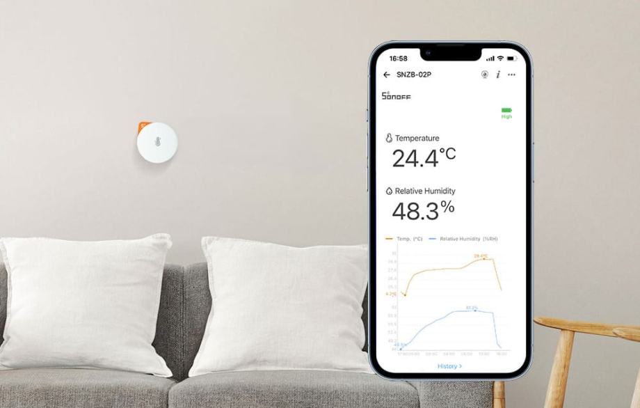Prikladna primjena senzora nudi širok spektar funkcionalnosti: od pohranjivanja i izvoza podataka do podnošenja obavijesti, kada su pragovi udobnosti premašene, do mogućnosti stvaranja pametnih scena. Ove pametne scene omogućuju različite uređaje u kući automatski u skladu s promjenama temperature i vlage.