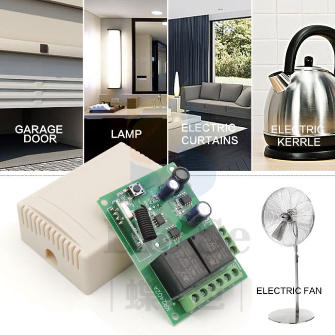 Dvokanalni RF prekidač (prekida dva neovisna strujna kruga) sa daljinskim upravljačem. Moguće dodavanje do 25 daljinskih upravljača. Mogućnost učenja koda sa vašeg već postojećeg daljinskog. Uređaj podržava fiksni ili rotirajući kod.