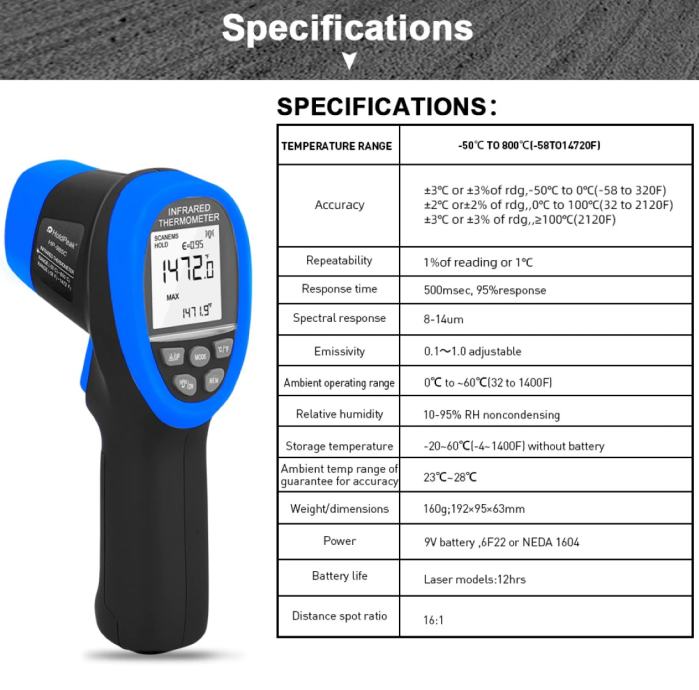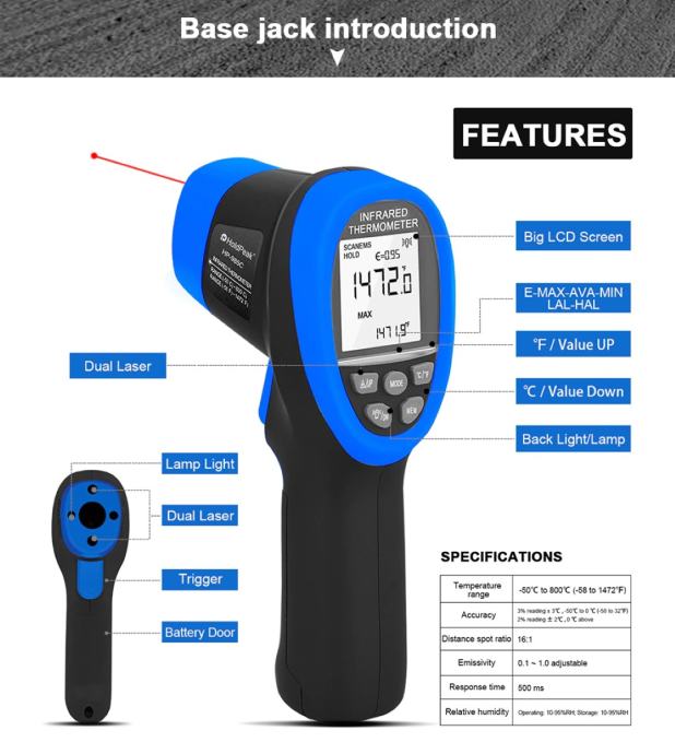 Bezkontaktni infracrveni laserski termometar od - 50 ~ 800 ℃ HP-985C