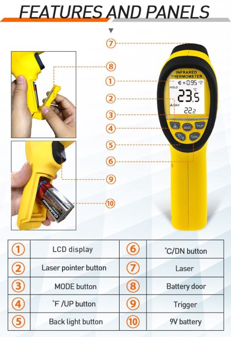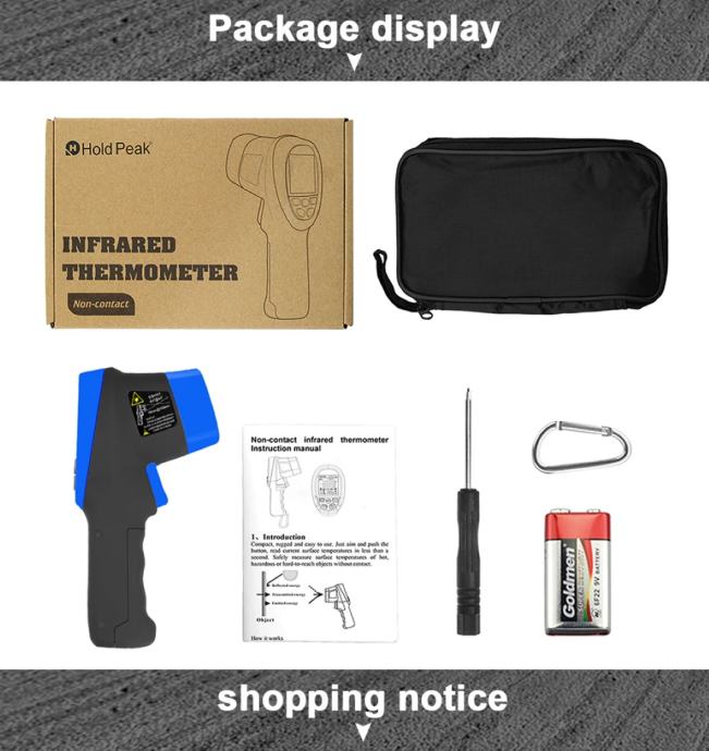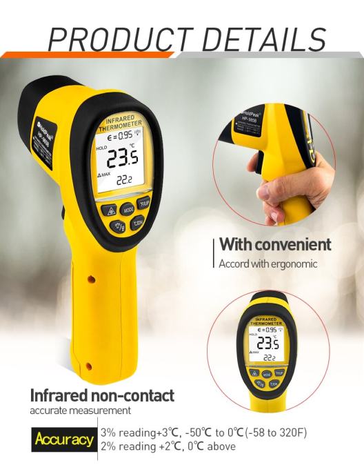 Potpuno novi laserski bezkontaktni termometar sa digitalnim displayem marke HoldPeak model HP-985C žuto crni u retail ambalaži s kopčom i torbicom.
