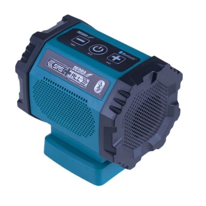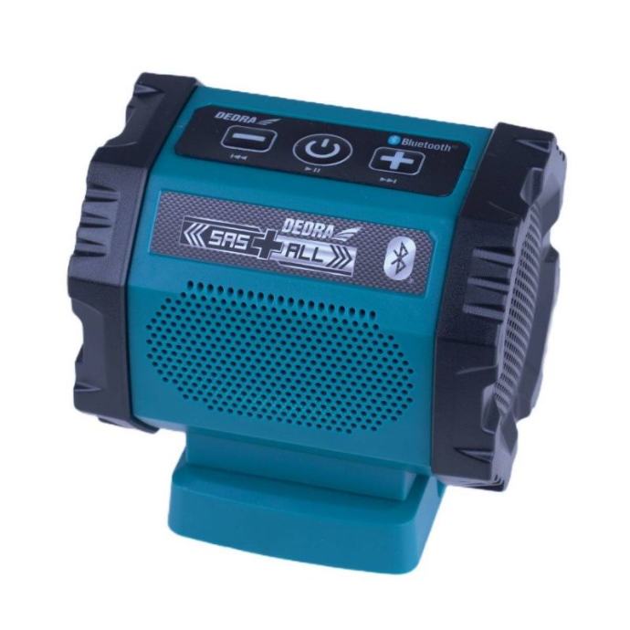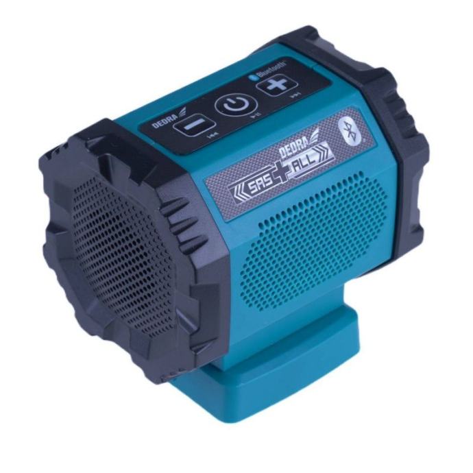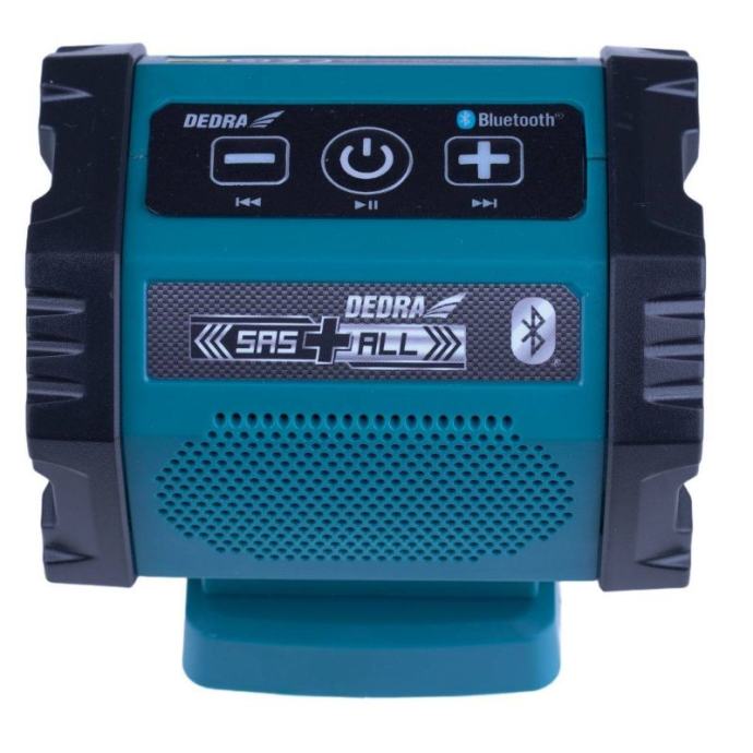 SAS+ALL DED7004 18V bluetooth bežični zvučnik.Ovaj proizvod je za sve koji imaju električne alate iz sustava SAS+ALL. Napajan istom baterijom, zvučnik je idealan da vaš radni dan učinite ugodnijim uz glazbu. Bluetooth zvučnik ima Bluetooth 4.2 tehnologiju prijenosa podataka.Uređaj ima dva odvojena zvučnika, tako da je kvaliteta zvuka izvrsna čak i na visokimvolumen. Glazba se također može streamati putem AUX priključka na prednjoj ploči. Treća tipka – krajnja desna – služi za uključivanje/isključivanje. Upravljačka ploča nalazi se na vrhu jedinice.Tipke s dvostrukom funkcijom omogućuju brzo i jednostavno upravljanje zvučnikom.Ugrađeni USB priključak daje vam mogućnost punjenja uređaja poput pametnog telefona dok slušate glazbu.Značajke SAS+ALL DED7004 punjivog zvučnika:Konstrukcijski bluetooth punjivi zvučnikBluetooth 4.2 - manja potrošnja energije, veći dometUSB priključak za punjenje vašeg telefonaAUX priključak za prijenos glazbe putem kabelaDva odvojena zvučnika - vrlo dobra kvaliteta zvukaUpravljačka ploča jednostavna za korištenjeDEDRA SAS+ALL line zvučnik na baterijeTehnički parametri zvučnika konstrukcije SAS+ALL DED7004:Napon: 18 VVrsta prijenosa podataka: Bluetooth 4.2, AUXSnaga zvučnika: 2 x 3WAUX konektor: 3,5 mmUSB konektor: 5V/2.0ATežina bez baterija: 0,21 kgPribližna vremena rada za baterije:2Ah - DED7032: pribl. 15 sati (slušanje glazbe) / cca. 5 sati (istovremeno slušanje glazbe i punjenje telefona)4Ah - DED7034: pribl. 30 sati (slušanje glazbe) / cca. 10 sati (istovremeno slušanje glazbe i punjenje telefona)5Ah - DED7035: pribl. 37 sati (slušanje glazbe) / cca. 12,5 sati (istovremeno slušanje glazbe i punjenje telefona)6Ah - DED6936: pribl. 55 sati (slušanje glazbe) / cca. 19 sati (istovremeno slušanje glazbe i punjenje telefona)8Ah - DED6937: pribl. 74 sata (slušanje glazbe) / cca. 25 sati (istovremeno slušanje glazbe i punjenje telefona)Uključeno:Punjivi zvučnik]]>