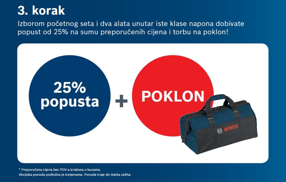 3. korak: Izborom početnog seta i DVA alata unutar iste klase napona dobivate popust od 25% na sumu preporučenih cijena i torbu na poklon!