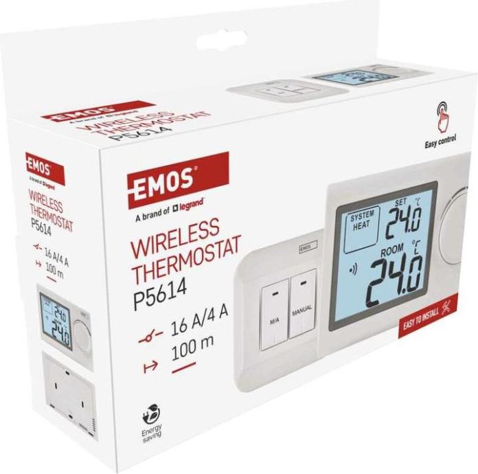 Termostat P5614 je elegantna in tehnološko sodobna izbira za stanovanja, hiše ali pisarne. Omogoča enostavno nastavljanje želene temperature (od 5 °C do 35 °C) in nadzor nad ogrevalnimi in hladilnimi sistemi – brez potrebe po žičnem priklopu.