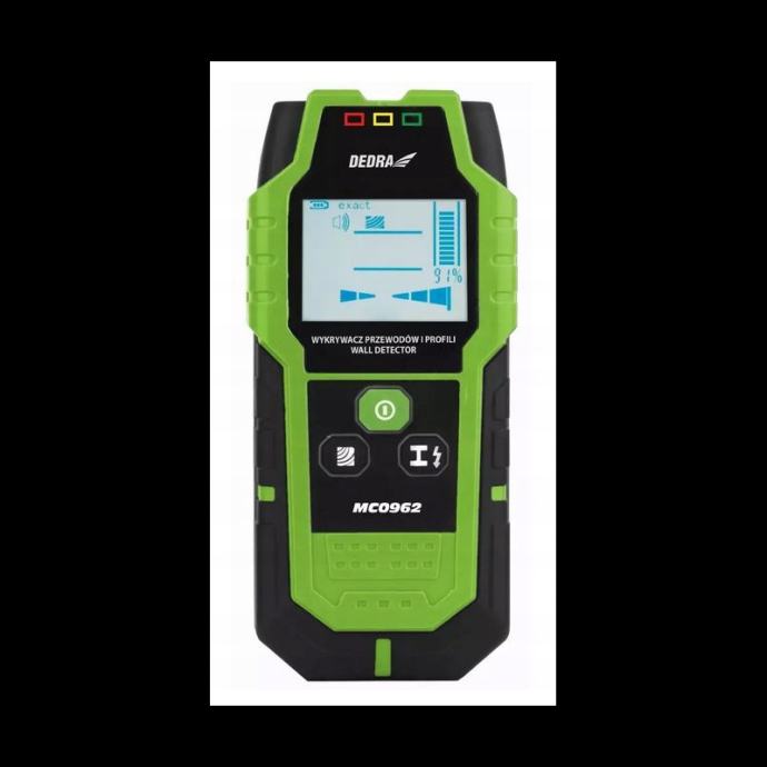 lako čitljiv, pozadinski osvijetljen bijeli LED zaslon od 2"LED diode koje signaliziraju detekciju traženog materijala u 3 boje: zelena/žuta/crvenazvučni signalautomatsko isključivanje nakon 5 minuta neaktivnostidetekcija profila, cijevi i žica sa i bez izmjeničnog naponagumirani elementi kućišta poboljšavaju prianjanjeudobna torbica i kopča za remenvisoka osjetljivost i središnja lokacijaindikator postotka Tehnički podaci detektora žica i profila MC0962:napajanje: 9V DC (6F22)zaslon: LED 2"pozadinsko osvjetljenje zaslona: dasvjetlosni indikator: da (zeleno, žuto, crveno)zvučni alarm: davrsta detektiranih objekata: drvo/metal/feromagnetski metal/žice pod izmjeničnim naponomdubina detekcije drvenih profila: 20 mm (fino) / 38 mm (grubo)dubina detekcije AC žica pod naponom: 50 mmdubina detekcije za obojene metale, npr. bakrene cijevi: 100 mmdubina detekcije za feromagnetske metale: 120 mmradna temperatura: -10~-50℃temperatura skladištenja: -20~-70℃]]>