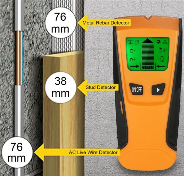 Otkriva metal do dubine od 76 mm; Otkriva AC žicu do 76 mm dubine; Otkriva drveni i metalni štap do 38 mm