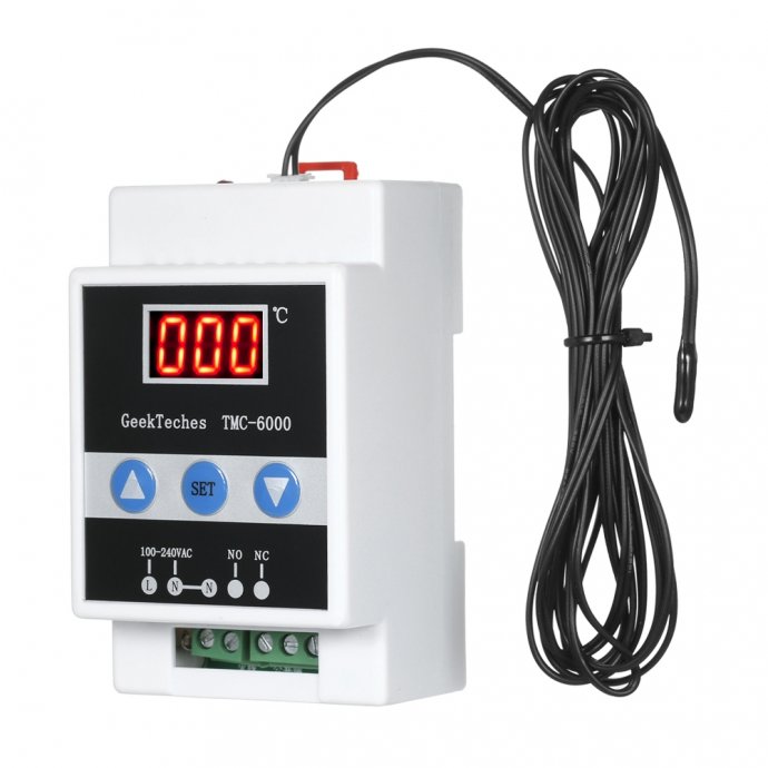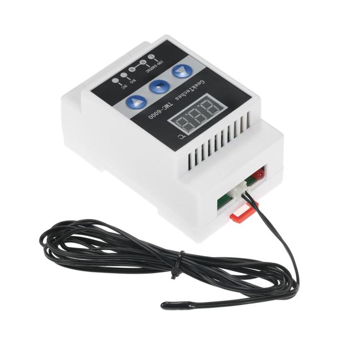 Digitalni termostat TMC-6600 DIN šina -5 do +110C 110-240V. Može se montirati na DIN razdjelnicu među automatske osigurače, zauzima prostor kao trofazni automatski osigurač. Dolazi s NTC 10K sondom (kabel sonde može se produljiti i do nekoliko desetaka metara u slučaju potrebe). Moguće namjene: kontrola sustava za spriječavanje zamrzavanja vodovodnih cijevi, rina, krovova.... za mini sušare, regulaciju temperature prostora itd. itd. Prikaz temperature je po 0,1C a podešavanje je po 1C.