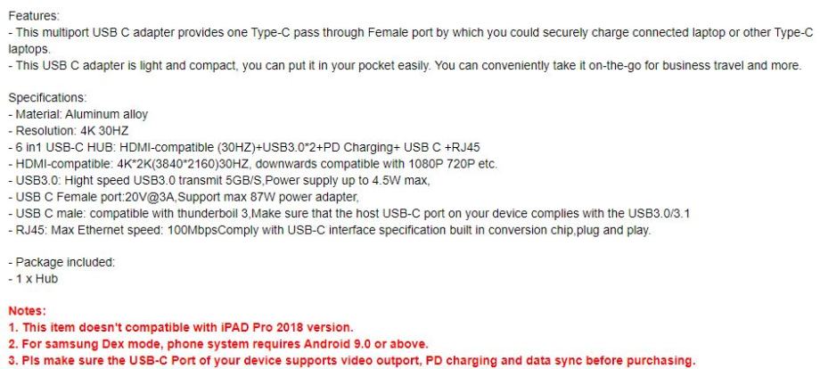 2× USB-C female: 20V@3A,Support max 87W power adapter for MacBook Pro Type C Splitter