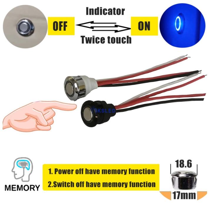 Senzor na dodir - za LED trake ili LED žarulje (LED dimmer) sa plavim osvjetljenjem, malih dimenzija i jednostavne montaže za napone do 24V i struje do 4A. Dvije funkcije, prekidač ili dimmer. Kratkotrajnim dodirom palimo i gasimo svjetlo. Duljim pritiskom se regulira jačina svjetla na više i niže. Može poslužiti i za reguliranje vrtnje motora. Dvije boje srebrna (krom) i crna.