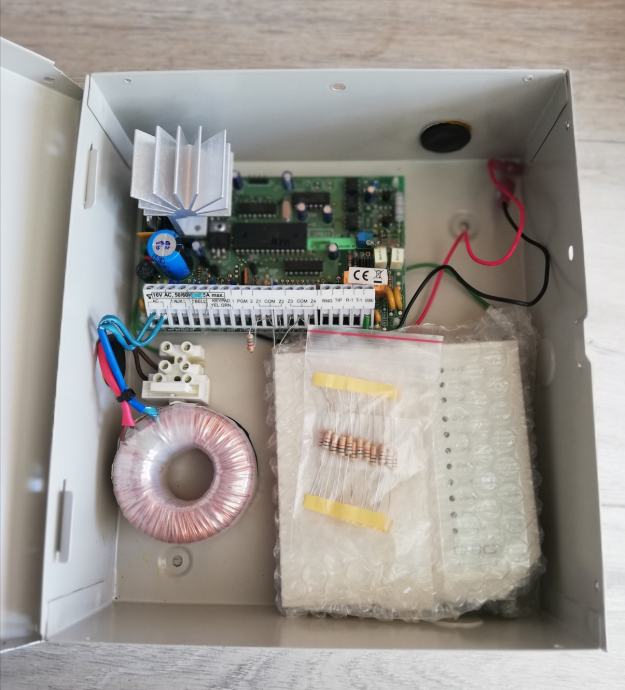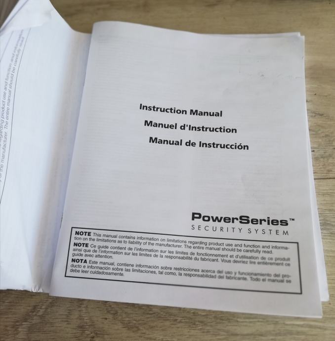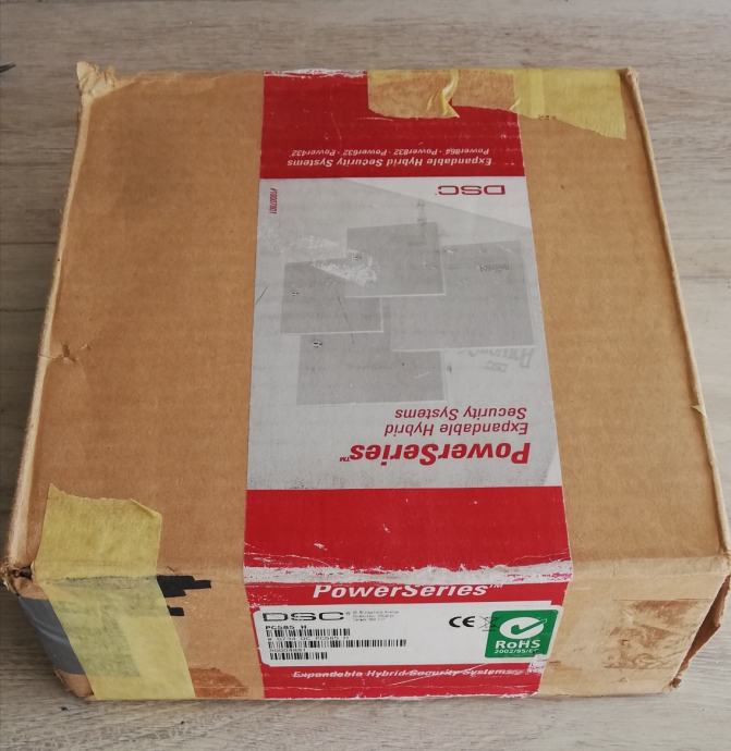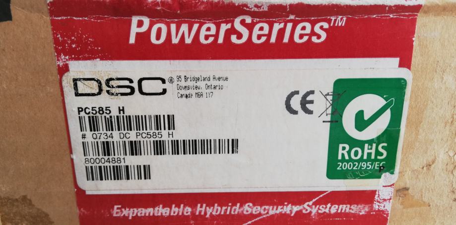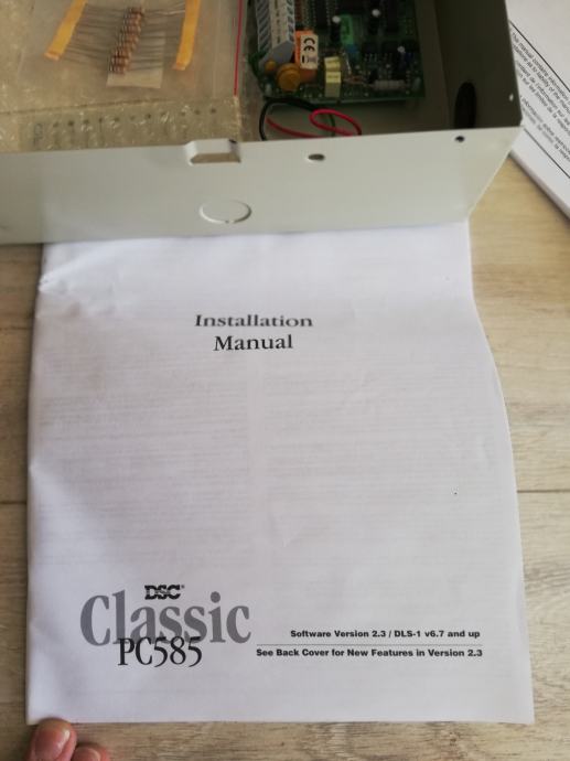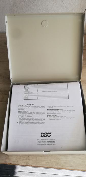 Alarmni sustav DSC u kompletu: pločica centrale 585, priključne stezaljke , original tipkovnica led PK 1555 RKZ, limeno kućište i upute za programiranje i korištenje na engleskom jeziku.