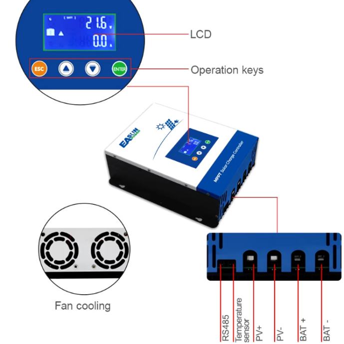 Prodajem NOVI u originalnoj ambalaži EASUN MPPT-10048 profesionalni 12V / 24V / 36V / 48V - 100A solar regulator punjenja sa PV naponom do 150V, niže navedenih karakteristika.