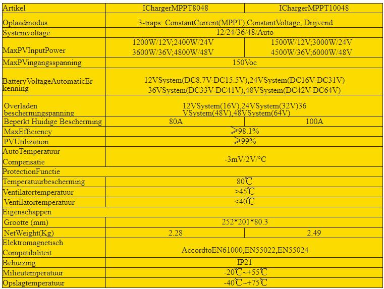 Podržava baterijske sustave AGM, GEL, Flouded (kiselinske) i Lithium LifePo4 za navedene napone sa snagom ploča koje se u izabranom modu rada mogu spojiti na ovaj regulator punjenja: