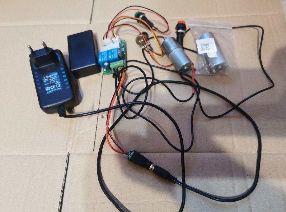 2. Na slikama 4, 5 i 6 je napajanje od 12V, elektronika za regulaciju brzine i promjenu smjera okretaja te 2 DC motora sa reduktorom. Jedan komplet je složen i isproban, drugi motor nekorišten. Regulacija brzine od 0-100 okr/min, prodaje se u kompletu za 200kn. - PRODANO