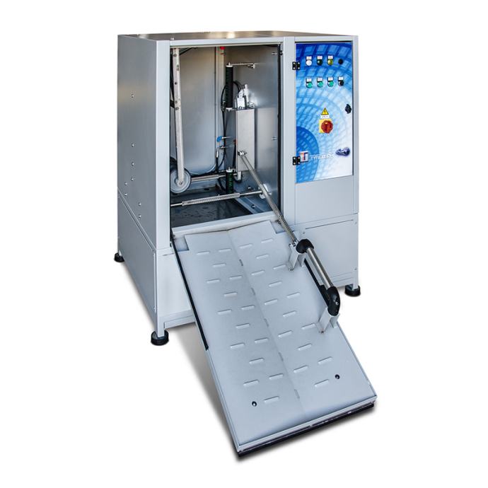 Kotač se automatski raspršuje s obje strane kroz mlaznice deterdženta, zahvaljujući kretanju kotača, deterdžent ravnomjerno pokriva cijelu površinu i djeluje i na felge. Uređaj automatski kontrolira količinu deterdženta. Nakon toga mlazovi vode stupaju u akciju i ubrizgavaju se za vrijeme odabranog programa pranja vodom. Na kraju ciklusa pranja izvadite kotač iz komore za pranje i zatvorite poklopac. Program pranja služi za pranje komore za pranje za čišćenje jedinice, ovu funkciju odabire rukovatelj na kraju radnog dana kako bi očistio unutrašnjost jedinice od prljavštine i / ili ostataka deterdženta.