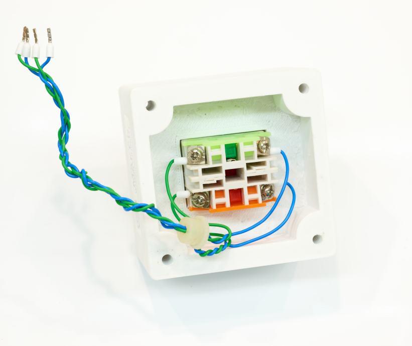 Emergency STOP, na pritisak blokira u doljnjem položaju, za povratak treba tipku rotirati. Kontakti 1NO + 1NC. Kućište izvedeno 3D printanjem. Korišteno za izradu prototipa CNC stroja. Dimenzije kućišta 80x80x50 mm, s podignutim tipkalom 80x80x75 mm.