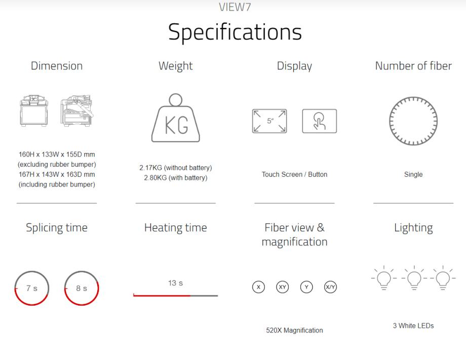 VIEW 7 najučinkovitiji fuzijski uređaj za poravnavanje jezgre je najsnažniji i najinovativniji uređaj za spajanje na tržištu s najvećom stopom povećanja slike vlakana na svijetu. View 7' opremljen je GUI-jem prilagođenim korisniku na LCD-u u boji visoke rezolucije koji korisnicima koji prvi put spajaju omogućuje jednostavno povezivanje optičkog vlakna. Dvostrukim dodirom zaslona svi korisnici mogu vidjeti i zumirati optičko vlakno do 520 puta.