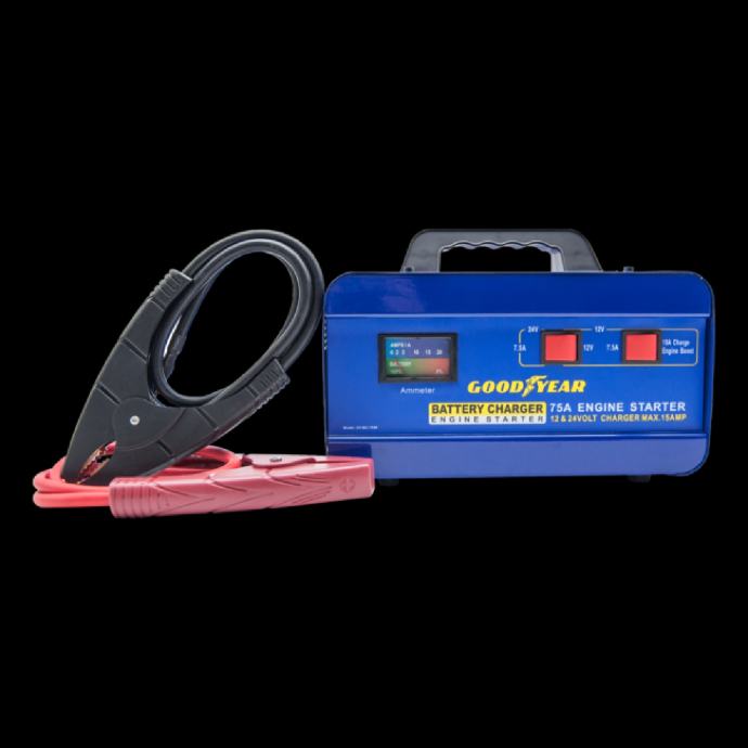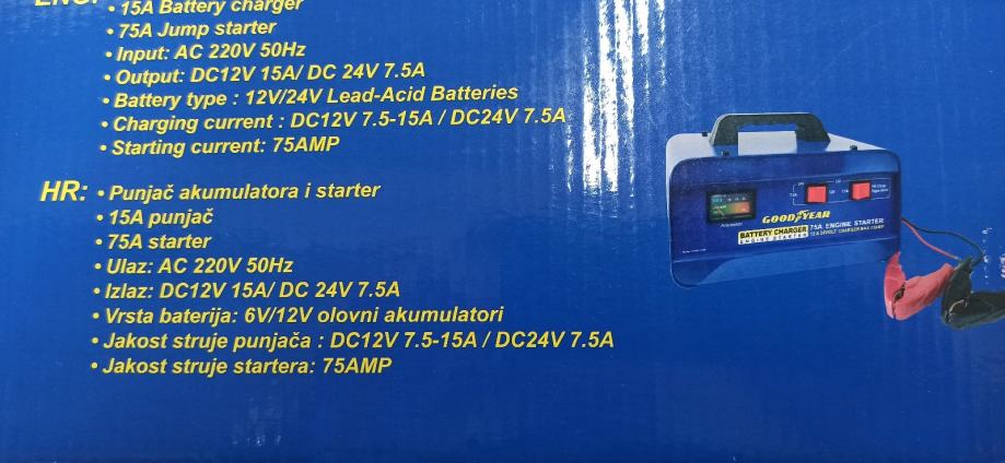 Punjač akumulatora i starter. 15A punjač akumulatora. 75A Starter. Ulaz: AC 220V 50 Hz. Izlaz: DC12V 15A/ DC 24V 7.5A. Vrsta akumulatora : 12V/24V olovni akumulator. Struja punjenja : DC12V 7.5-15A / DC24V 7.5A. Struja startanja: 75 A.