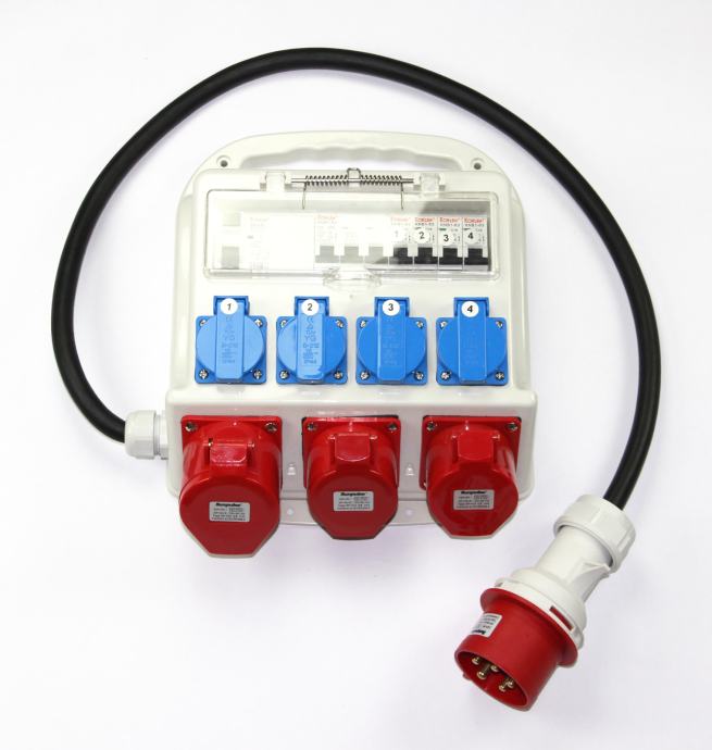 Razdjelnik struje ima 2 x CEE400V-16A; 1 x CEE400V-32A priključci i za 4 standardne 230V Schuko utičnice