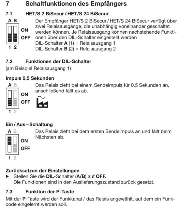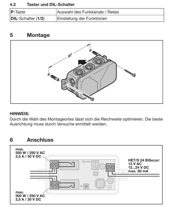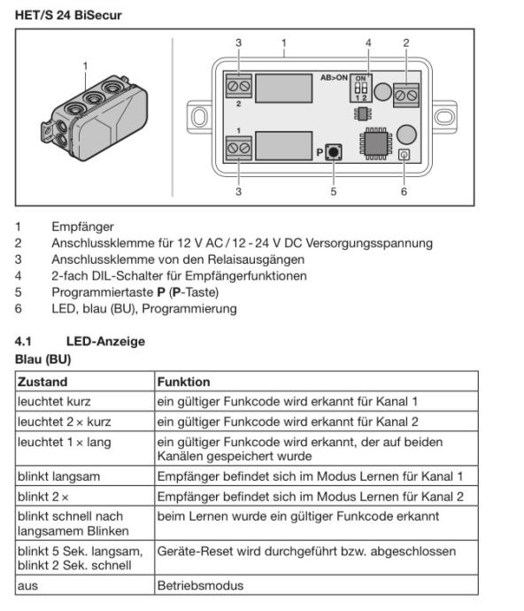 Hörmann HET / S 24-868-BS radio prijemnik na 12/24 V je kompatibilan s najnovijim daljinskim odašiljačima na 868 MHz BiSecur. Prijemnik je pogodan za Hörmann pogone i upravljanje pomoću Hormann daljinskih upravljača vrata i s pomoću BiSecur tehnologije moguće je uključiti i isključiti svjetlo u dvorištu ili druge električne potrošače i kontrolirati eksterne (vanjske) pogone ili za upravljanje (impulsnim) pogonima trećih strana sa 2 pomična kontakta (za to je potreban pulsni odašiljač ili daljinski upravljač s BiSecur tehnologijom). Dvokanalni relejni prijemnik je u zasebnom hermetičkom kućištu s dva bezpotencijalna releja.