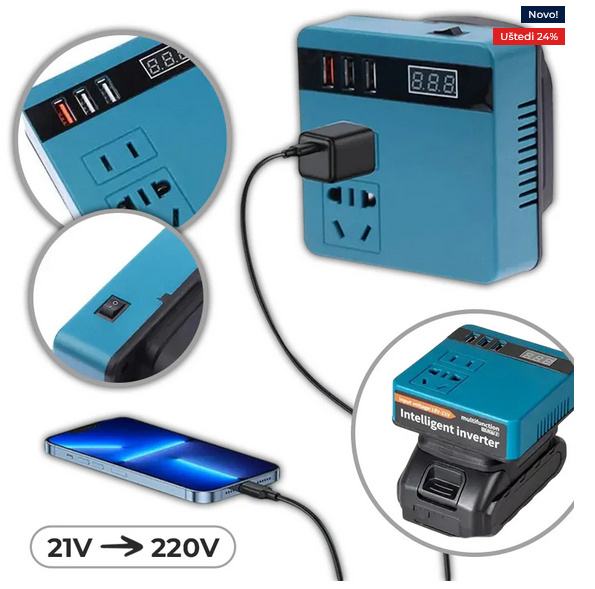 Kompaktni i pouzdani inverter pretvara 21 V Makita-kompatibilnu bateriju u 220 V AC izlaz snage do 300 W, čime omogućuje neprekidno napajanje električnih alata, rasvjete i prijenosne elektronike na terenu ili u hitnim situacijama.