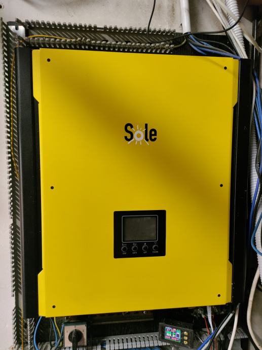 Prodajem korišteni pretvarač napona Sole 48VDC / 230VAC / 3000W koji može raditi i ON GRID, odnosno sinhronizirat se i predavat energiju u mrežu, znači to je model OFF GRID / ON GRID. Pretvarač je slikan prije demontaže jer je čitav solarni sustav pojačavan sa novim inverterima.