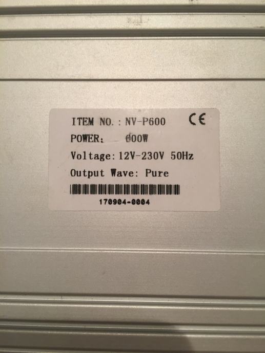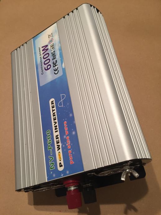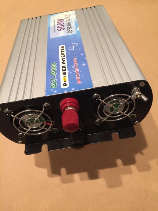 Inverteri su PUNI SINUS s DC napona 12V na AC 230V, 600 W kontinuirano i vršne snage 1.200W (10 ms). Uređaj ne dolazi u originalnoj kutiji.