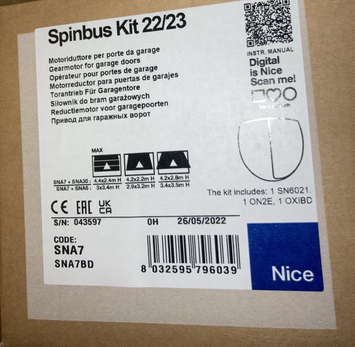 Nice Spinbus motor je za ukupnu površinu sekcijskih vrata do 10,5 m2 i podizno-preklopna vrata s oprugom do 11,8 m2. Nepovratni elektromehanički motor s reduktorom (SPIN23) i s prethodno montiranom vodilicom od 3 m je za stambenu uporabu.